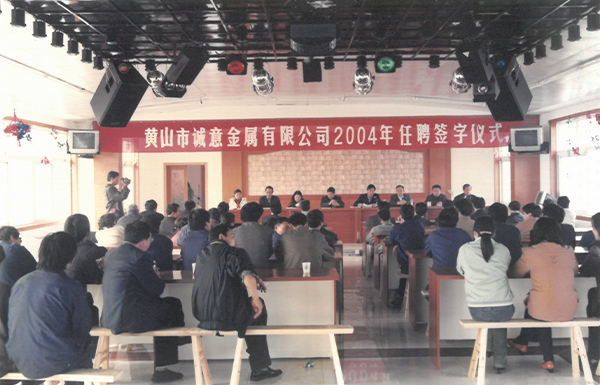 1994年9月26日,汪小五先生創(chuàng)建歙縣誠意制釘廠。1996年改建成立歙縣誠意鉛絲制釘廠。1997年注冊“誠意”商標。1999年3月24日注冊成立黃山市誠意金屬有限公司,生產(chǎn)鐵釘、鉛絲,銷售建筑鋼材,當年躋身“黃山市民營企業(yè)50強”行列。